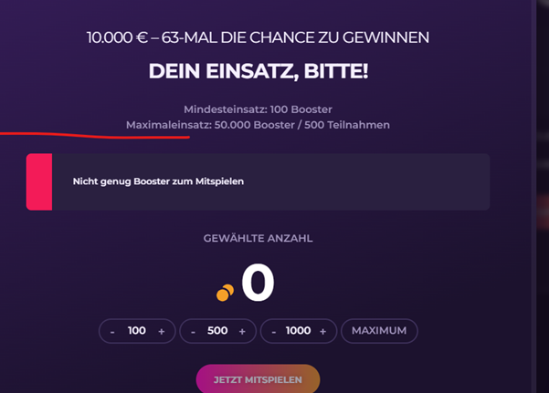 Gibt es eine Limitobergrenze für den Einsatz von Boostern? Ja, diese wird im Spielkonto angezeigt. Sie erhalten bei Überschreitung dieser Grenze eine Hinweismeldung.